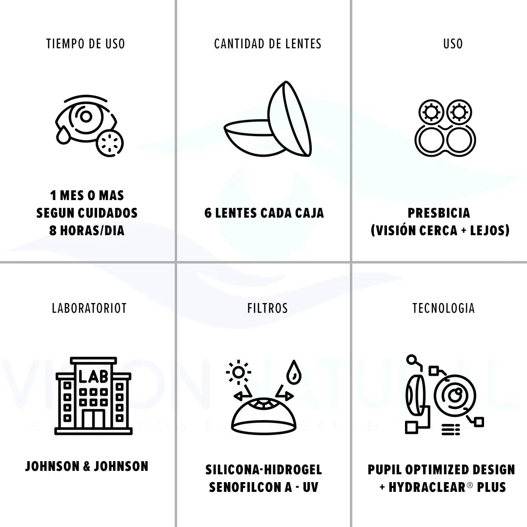 Las Acuvue oasys Multifocal ofrecen una solución cómoda y efectiva para corregir la visión de cerca y de lejos. Su innovadora tecnología garantiza una transición suave entre las zonas de enfoque, favoreciendo la nitidez visual. Además, su comodidad y durabilidad las hacen ideales para un uso prolongado. ¡Descubre más sobre estas lentes multifocales!
